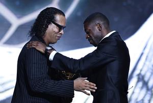 (250923) -- PARIS, 23 septiembre, 2025 (Xinhua) -- Imagen del 22 de septiembre de 2025 del jugador francés de Paris Saint-Germain, Ousmane Dembele (d), recibiendo el Balón de Oro de manos del exfutbolista brasileño, Ronaldinho, durante la ceremonia de premiación del Balón de Oro 2025 de France Football en el Teatro del Chatelet, en París, Francia. (Xinhua/Gao Jing) (oa) (ah) (vf)