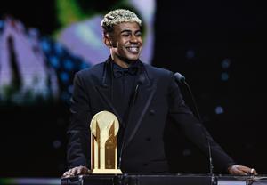 (250923) -- PARIS, 23 septiembre, 2025 (Xinhua) -- Imagen del 22 de septiembre de 2025 del jugador español de Barcelona, Lamine Yamal, hablando después de recibir el Trofeo Kopa al mejor jugador menor de 21 años durante la ceremonia de premiación del Balón de Oro 2025 de France Football en el Teatro del Chatelet, en París, Francia. (Xinhua/Gao Jing) (oa) (ah) (vf)