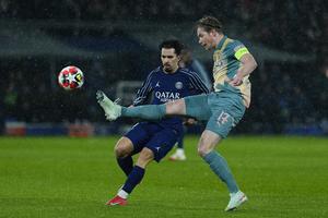 (250123) -- PARIS, 23 enero, 2025 (Xinhua) -- Imagen del 22 de enero de 2025 de Vitinha (i), de Paris Saint-Germain, disputando el balón con Kevin De Bruyne, de Manchester City, durante el partido de fútbol de la Liga de Campeones de la UEFA entre Paris Saint-Germain y Manchester City, en París, Francia. (Xinhua/Glenn Gervot) (rtg) (ra) (ce)