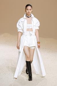 (251005) -- PARIS, 5 octubre, 2025 (Xinhua) -- Imagen del 4 de octubre de 2025 de una modelo presentando una creación de las colecciones listas para usar Primavera/Verano 2026 de Hermes durante la Semana de la Moda de París, en París, Francia. (Xinhua/MeetEurope) (oa) (ah)