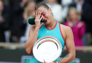 (250608) -- PARIS, 8 junio, 2025 (Xinhua) -- Imagen del 7 de junio de 2025 de Aryna Sabalenka reaccionando durante la ceremonia de premiación para el partido final de individuales femeninos, en el torneo de tenis Abierto de Francia, en Roland Garros, en París, Francia. (Xinhua/Gao Jing) (rtg) (da)