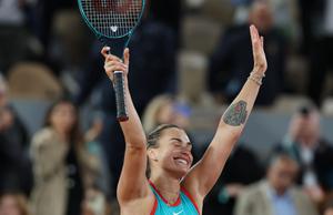 (250606) -- PARIS, 6 junio, 2025 (Xinhua) -- Imagen del 5 de junio de 2025 de Aryna Sabalenka festejando después de ganar la semifinal de individuales femeninos entre Aryna Sabalenka, de Bielorrusia, e Iga Swiatek, de Polonia, en el torneo de tenis Abierto de Francia, en Roland Garros, en París, Francia. (Xinhua/Gao Jing) (rtg) (ra) (ce)