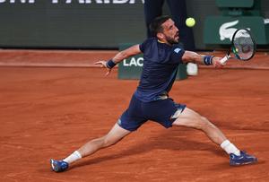 (250531) -- PARIS, 31 mayo, 2025 (Xinhua) -- Imagen del 30 de mayo de 2025 de Damir Dzumhur, de Bosnia y Herzegovina, devolviendo la pelota durante el partido de tercera ronda de individuales masculinos ante Carlos Alcaraz, de España, en el torneo de tenis Abierto de Francia, en Roland Garros, en París, Francia. (Xinhua/Li Jing) (rtg) (da)