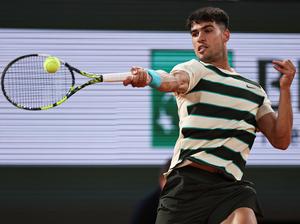 (250531) -- PARIS, 31 mayo, 2025 (Xinhua) -- Imagen del 30 de mayo de 2025 de Carlos Alcaraz, de España, devolviendo la pelota durante el partido de tercera ronda de individuales masculinos ante Damir Dzumhur, de Bosnia y Herzegovina, en el torneo de tenis Abierto de Francia, en Roland Garros, en París, Francia. (Xinhua/Li Jing) (rtg) (da)