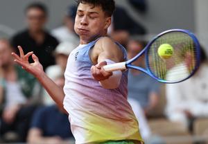 (250602) -- PARIS, 2 junio, 2025 (Xinhua) -- Imagen del 1 de junio de 2025 de Ben Shelton, de Estados Unidos, devolviendo la pelota durante el partido de cuarta ronda de individuales masculinos ante Carlos Alcaraz, de España, en el torneo de tenis Abierto de Francia, en Roland Garros, en París, Francia. (Xinhua/Li Jing) (rtg) (oa) (ce)