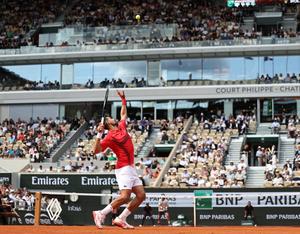 (250603) — PARíS, 3 junio, 2025 (Xinhua) — Imagen del 2 de junio de 2025 de Novak Djokovic, de Serbia, sirviendo la pelota a Cameron Norrie, de Reino Unido, durante el partido de cuarta ronda de individuales masculinos en el torneo de tenis Abierto de Francia, en Roland Garros, en París, Francia. (Xinhua/Li Jing) (oa) (ra) (vf)
