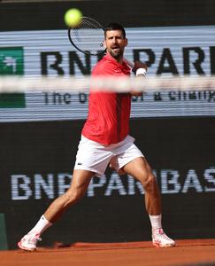 (250603) -- PARíS, 3 junio, 2025 (Xinhua) -- Imagen del 2 de junio de 2025 de Novak Djokovic, de Serbia, devolviendo la pelota a Cameron Norrie, de Reino Unido, durante el partido de cuarta ronda de individuales masculinos en el torneo de tenis Abierto de Francia, en Roland Garros, en París, Francia. (Xinhua/Li Jing) (oa) (ra) (vf)