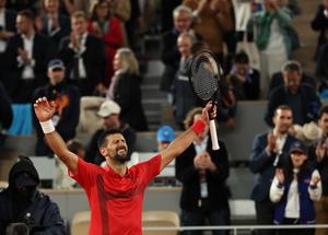 (250605) -- PARIS, 5 junio, 2025 (Xinhua) -- Imagen del 4 de junio de 2025 de Novak Djokovic festejando después de ganar el partido de cuartos de final de individuales masculinos entre Alexander Zverev, de Alemania, y Novak Djokovic, de Serbia, en el torneo de tenis Abierto de Francia, en Roland Garros, en París, Francia. (Xinhua/Li Jing) (rtg) (ra) (ce)