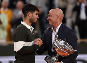 (250609) -- PARIS, 9 junio, 2025 (Xinhua) -- Imagen del 8 de junio de 2025 de Andre Agassi (d) presentando el trofeo a Carlos Alcaraz después de la final de individuales masculinos entre Jannik Sinner, de Italia, y Carlos Alcaraz, de España, en el torneo de tenis Abierto de Francia, en Roland Garros, en París, Francia. (Xinhua/Li Jing) (rtg) (oa) (ce)