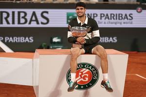 (250609) -- PARIS, 9 junio, 2025 (Xinhua) -- Imagen del 8 de junio de 2025 de Carlos Alcaraz posando con el trofeo después de ganar la final de individuales masculinos entre Jannik Sinner, de Italia, y Carlos Alcaraz, de España, en el torneo de tenis Abierto de Francia, en Roland Garros, en París, Francia. (Xinhua/Li Jing) (rtg) (oa) (ce)