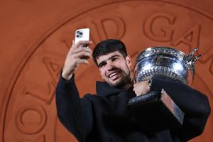 (250609) -- PARIS, 9 junio, 2025 (Xinhua) -- Imagen del 8 de junio de 2025 de Carlos Alcaraz tomándose una fotografía con el trofeo después de ganar la final de individuales masculinos entre Jannik Sinner, de Italia, y Carlos Alcaraz, de España, en el torneo de tenis Abierto de Francia, en Roland Garros, en París, Francia. (Xinhua/Li Jing) (rtg) (oa) (ce)