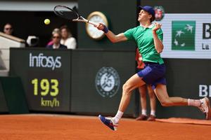 (250608) -- PARIS, 8 junio, 2025 (Xinhua) -- Jannik Sinner devuelve la pelota durante la final de individuales masculinos entre Jannik Sinner, de Italia, y Carlos Alcaraz, de España, en el torneo de tenis Abierto de Francia, en Roland Garros, en París, Francia, el 8 de junio de 2025. (Xinhua/Li Jing) (oa) (da)