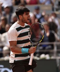 (250608) -- PARIS, 8 junio, 2025 (Xinhua) -- Carlos Alcaraz festeja un punto durante la final de individuales masculinos entre Jannik Sinner, de Italia, y Carlos Alcaraz, de España, en el torneo de tenis Abierto de Francia, en Roland Garros, en París, Francia, el 8 de junio de 2025. (Xinhua/Li Jing) (oa) (da)
