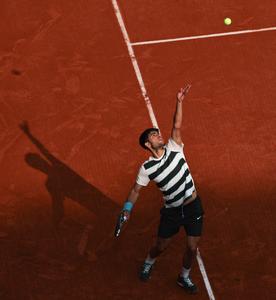 (250609) -- PARIS, 9 junio, 2025 (Xinhua) -- Imagen del 8 de junio de 2025 de Carlos Alcaraz sirviendo la pelota durante la final de individuales masculinos entre Jannik Sinner, de Italia, y Carlos Alcaraz, de España, en el torneo de tenis Abierto de Francia, en Roland Garros, en París, Francia. (Xinhua/Li Jing) (rtg) (oa) (vf)