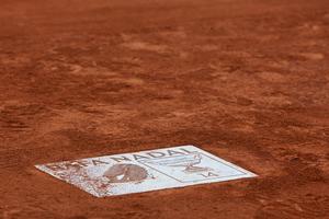 (250526) -- PARIS, 26 mayo, 2025 (Xinhua) -- Imagen del 25 de mayo de 2025 de una placa con la huella del ex tenista español, Rafael Nadal en honor a su carrera, durante el torneo de tenis Abierto de Francia, en la Cancha Philippe Chatrier, en Roland Garros, en París, Francia. (Xinhua/Li Jing) (rtg) (ah) (vf)