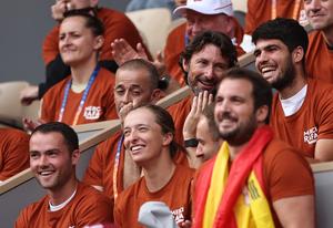 (250526) -- PARIS, 26 mayo, 2025 (Xinhua) -- Carlos Alcaraz (d-arriba), Iga Swiatek (c-frente) y Juan Carlos Ferrero (2-d-arriba), asistiendo a una ceremonia llevada a cabo para honrar la carrera del ex tenista español, Rafael Nadal, durante el torneo de tenis Abierto de Francia, en la Cancha Philippe Chatrier, en Roland Garros, en París, Francia. (Xinhua/Li Jing) (rtg) (ah) (vf)