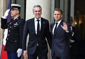 (250904) -- PARÍS, 4 septiembre, 2025 (Xinhua) -- El presidente francés, Emmanuel Macron (d), saluda al primer ministro neerlandés, Dick Schoof (c), a su llegada para asistir a la reunión de la "Coalición de Voluntarios", en el Palacio del Elíseo, en París, Francia, el 4 de septiembre de 2025. Macron anunció el jueves que 26 países, en su mayoría europeos, prometieron de manera formal desplegar soldados como parte de un futuro cese al fuego ruso-ucraniano, aunque no directamente en la línea del frente. (Xinhua/Gao Jing) (rtg) (ra) (ce)