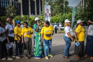 (250412) -- LIBREVILLE, 12 abril, 2025 (Xinhua) -- Imagen del 10 de abril de 2025 de personas asistiendo a una campaña del presidente de transición, Brice Clotaire Oligui Nguema, en Libreville, Gabón. Gabón lleva a cabo el sábado sus primeras elecciones presidenciales desde un golpe de Estado de hace dos años, marcando la fase final de la transición política del país y el esperado retorno al orden constitucional. (Xinhua/Wang Guansen) (jg) (da)