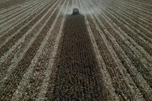 (240702) -- BRASILIA, 2 julio, 2024 (Xinhua) -- Imagen aérea tomada con un dron del 2 de julio de 2024 de una máquina agrícola cosechando maíz en la granja Nativa, en el Núcleo Rural Buriti Vermelho, en Brasilia, Brasil. (Xinhua/Lucio Tavora) (lt) (jg) (ra) (ce)