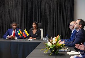 (260410) -- SAINT GEORGE, 10 abril, 2026 (Xinhua) -- Imagen proveída por la Presidencia de Venezuela del 9 de abril de 2026 del primer ministro de Granada, Dickon Mitchell (i), participando en un encuentro con la presidenta encargada venezolana, Delcy Rodríguez (2-i), en la sede del Parlamento, en Saint George, Granada. Rodríguez inició el jueves su primera gira internacional tras asumir el cargo con una visita oficial a la isla caribeña Granada, orientada a fortalecer la cooperación bilateral y la integración regional. (Xinhua/Presidencia de Venezuela) (ms) (rtg) (ra) (ce)