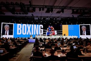 (250320) -- COSTA NAVARINO, 20 marzo, 2025 (Xinhua) -- El presidente del Comité Olímpico Internacional (COI), Thomas Bach, pronuncia un discurso para la inclusión del boxeo en los Juegos Olímpicos de Los Angeles 2028 durante el segundo día de la 144ª sesión del Comité Olímpico Internacional (COI), en Costa Navarino, Grecia, el 20 de marzo de 2025. (Xinhua/Cao Can) (da) (ra) (vf)