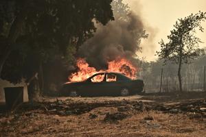 (250731) -- DROSOPIGI, 31 julio, 2025 (Xinhua) -- Imagen del 26 de julio de 2025 de un automóvil incendiándose, en Drosopigi, en la región de Atica Oriental, Grecia. El sábado se desataron incendios forestales en numerosas zonas de Grecia debido a las recientes olas de calor extremas. El gobierno griego ha solicitado ayuda al Mecanismo de Protección Civil de la Unión Europea para combatir el incendio. (Xinhua/Krioneri Tatiana Bolari) (da) (ra) (ce)