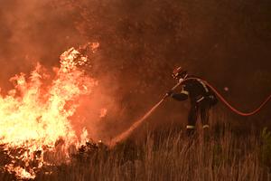 (250731) -- DROSOPIGI, 31 julio, 2025 (Xinhua) -- Imagen del 26 de julio de 2025 de un bombero combatiendo las llamas, en Drosopigi, en la región de Atica Oriental, Grecia. El sábado se desataron incendios forestales en numerosas zonas de Grecia debido a las recientes olas de calor extremas. El gobierno griego ha solicitado ayuda al Mecanismo de Protección Civil de la Unión Europea para combatir el incendio. (Xinhua/Krioneri Tatiana Bolari) (da) (ra) (ce)
