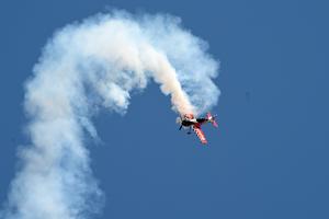 (250907) — TANAGRA, 7 septiembre, 2025 (Xinhua) — Imagen del 6 de septiembre de 2025 de un avión realizando una presentación durante un espectáculo aéreo en la base aérea de Tanagra, a unos 70 kilómetros al norte de Atenas, Grecia. La Semana Aeronáutica de Atenas 2025 comenzó aquí el sábado. (Xinhua/Marios Lolos) (oa) (da)