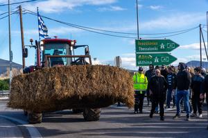 (260109) -- THIVA, 9 enero, 2026 (Xinhua) -- Imagen del 8 de enero de 2026 de agricultores bloqueando una autopista durante una protesta, en Thiva, a unos 70 kilómetros al norte de Atenas, Grecia. Agricultores griegos expresaron el jueves un cauto optimismo ante una renovada invitación del Gobierno para conversar con el primer ministro, Kyriakos Mitsotakis, mientras las protestas y los bloqueos de carreteras a nivel nacional entraron en una nueva fase. (Xinhua/Marios Lolos) (jg) (ra) (vf)