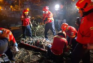 (250210) -- CIUDAD DE GUATEMALA, 10 febrero, 2025 (Xinhua) -- Rescatistas trasladan a una persona herida en el sitio de un accidente vial, en la Ciudad de Guatemala, Guatemala, el 10 de febrero de 2025. Decenas de personas fallecidas dejó un trágico accidente vial ocurrido la madrugada del lunes en la capital de Guatemala, cuando un autobús extraurbano cayó a un barranco a orillas de la Calzada La Paz, mientras que varios heridos que fueron trasladados al Hospital General San Juan de Dios, reportan medios locales. (Xinhua/Str) (ah) (vf)