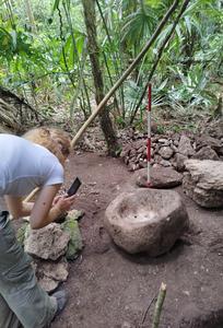 (250530) — PETEN, 30 mayo, 2025 (Xinhua) — Imagen cedida por el Ministerio de Cultura y Deportes de Guatemala del 4 de agosto de 2023 de una mujer tomando fotografías a una pieza descubierta en el yacimiento arqueológico de Uaxactún, en la Reserva de la Biosfera Maya, departamento de Petén, Guatemala. De acuerdo con el Ministerio de Cultura y Deportes de Guatemala, vestigios de una ciudad maya de hace más de 2.800 años fueron descubiertos dentro de una zona arqueológica en el norte de Guatemala. La ciudad, ubicada a 21 km al noreste de Uaxactún, fue bautizada como «Los Abuelos» por el hallazgo de dos esculturas antropomorfas que «representan a una pareja ancestral» y se trata de uno de los centros preclásicos más importantes del Petén. (Xinhua/Ministerio de Cultura y Deportes de Guatemala) (vf) (dp)