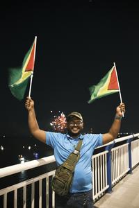 (251006) -- GEORGETOWN, 6 octubre, 2025 (Xinhua) -- Imagen del 5 de octubre de 2025 de un hombre sosteniendo banderas nacionales de Guyana mientras posa para una fotografía con fuegos artificiales en el nuevo puente sobre el río Demerara, en Georgetown, capital de Guyana. El nuevo puente sobre el río Demerara, oficialmente denominado Puente Bharrat Jagdeo y construido por China Railway Construction Corporation International, fue inaugurado la noche del domingo en una ceremonia en la que el presidente de Guyana, Irfaan Ali, destacó que esta infraestructura marca el inicio de una nueva era de transformación para el país sudamericano. (Xinhua/Xu Yongzheng) (rtg) (ah) (vf)