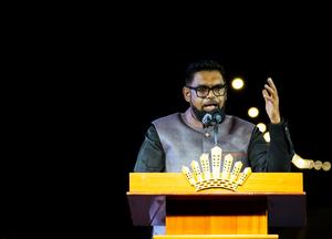 (251006) -- GEORGETOWN, 6 octubre, 2025 (Xinhua) -- Imagen del 5 de octubre de 2025 del presidente de Guyana, Irfaan Ali, hablando en la ceremonia de inauguración del nuevo puente sobre el río Demerara, en Georgetown, capital de Guyana. El nuevo puente sobre el río Demerara, oficialmente denominado Puente Bharrat Jagdeo y construido por China Railway Construction Corporation International, fue inaugurado la noche del domingo en una ceremonia en la que el presidente de Guyana, Irfaan Ali, destacó que esta infraestructura marca el inicio de una nueva era de transformación para el país sudamericano. (Xinhua/Xu Yongzheng) (rtg) (ah) (vf)