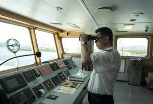 (250522) -- SAN LORENZO, 22 mayo, 2025 (Xinhua) -- Imagen del 20 de mayo de 2025 de un elemento de la Marina china observando a través de prismáticos durante la ceremonia de recepción de materiales de China para el proyecto de ampliación de escuelas agrícolas, en el puerto de Henecán, en el municipio de San Lorenzo, departamento de Valle, Honduras. China anunció un paquete de medidas de apoyo para Honduras, que incluye: la disposición de importar 12.000 toneladas de camarón hondureño durante el próximo año, sobre la base de una capacidad suficiente, garantía de calidad y precios razonables; la ampliación continua de la compra de café hondureño; y la pronta adquisición en Honduras de hojas de tabaco y puros por un valor de 3 millones de dólares. (Xinhua/David de la Paz) (dp) (jg) (vf) (ce)