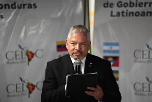 (250409) -- TEGUCIGALPA, 9 abril, 2025 (Xinhua) -- El canciller hondureño, Enrique Reina, habla con representantes de los medios de comunicación durante la IX Cumbre de Jefas, Jefes de Estado y de Gobierno de la Comunidad de Estados Latinoamericanos y Caribeños (CELAC), en Tegucigalpa, capital de Honduras, el 9 de abril de 2025. La IX Cumbre de Jefas, Jefes de Estado y de Gobierno de la CELAC inició el miércoles en la capital de Honduras, Tegucigalpa, con la presencia de más de una decena de mandatarios de la región. (Xinhua/David de la Paz) (dp) (jg) (da)