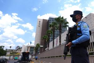 (250407) -- TEGUCIGALPA, 7 abril, 2025 (Xinhua) -- Un policía vigila frente al Banco Central de Honduras, que será la sede de la IX Cumbre de la Comunidad de Estados Latinoamericanos y Caribeños (CELAC), en Tegucigalpa, capital de Honduras, el 7 de abril de 2025. (Xinhua/David del Paz) (dp) (rtg) (ah) (vf)