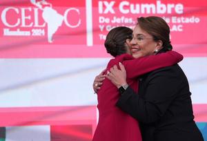 (250409) -- TEGUCIGALPA, 9 abril, 2025 (Xinhua) -- La presidenta hondureña, Xiomara Castro (d), recibe a la presidenta mexicana, Claudia Sheinbaum (i), a su llegada a la IX Cumbre de Jefas, Jefes de Estado y de Gobierno de la Comunidad de Estados Latinoamericanos y Caribeños (CELAC), en Tegucigalpa, capital de Honduras, el 9 de abril de 2025. La IX Cumbre de Jefas, Jefes de Estado y de Gobierno de la CELAC inició el miércoles en la capital de Honduras, Tegucigalpa, con la presencia de más de una decena de mandatarios de la región. (Xinhua/David de la Paz) (dp) (ah) (ra) (ce)