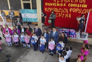 (250605) -- TEGUCIGALPA, 5 junio, 2025 (Xinhua) -- El embajador de China en Honduras, Yu Bo (c-i-atrás), posa con estudiantes de primer grado de primaria durante un acto de entrega de materiales escolares para alumnos del Centro de Educación Básica Alejandro Alvarenga con motivo del Día Internacional del Niño, en Tegucigalpa, capital de Honduras, el 5 de junio de 2025. Yu Bo afirmó que la educación es un pilar fundamental para cualquier nación. China construirá aulas en 100 centros de educación básica en todo el país centroamericano y entregará mochilas, pupitres y otros materiales didácticos a 300 escuelas. (Xinhua/David de la Paz) (dp) (jg) (da) (vf)