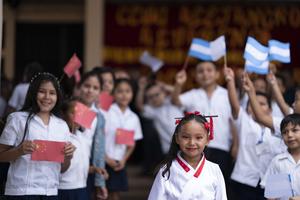 (250605) -- TEGUCIGALPA, 5 junio, 2025 (Xinhua) -- Estudiantes de primer grado de primaria esperan la llegada del embajador de China en Honduras, Yu Bo, previo a un acto de entrega de materiales escolares para alumnos del Centro de Educación Básica Alejandro Alvarenga con motivo del Día Internacional del Niño, en Tegucigalpa, capital de Honduras, el 5 de junio de 2025. Yu Bo afirmó que la educación es un pilar fundamental para cualquier nación. China construirá aulas en 100 centros de educación básica en todo el país centroamericano y entregará mochilas, pupitres y otros materiales didácticos a 300 escuelas. (Xinhua/David de la Paz) (dp) (jg) (da) (vf)