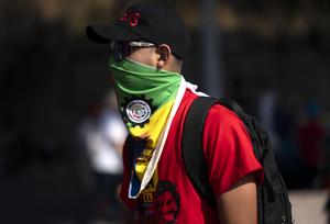 (250501) -- TEGUCIGALPA, 1 mayo, 2025 (Xinhua) -- Un ciudadano con el rostro cubierto participa en una marcha en conmemoración del Día Internacional de los Trabajadores, en Tegucigalpa, capital de Honduras, el 1 de mayo de 2025. (Xinhua/David de la Paz) (dp) (jg) (ah) (vf)