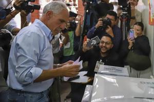 (251130) -- TEGUCIGALPA, 30 noviembre, 2025 (Xinhua) -- El candidato a la Presidencia de Honduras por el Partido Nacional, Nasry Asfura (i-frente), emite su voto en un colegio electoral durante las elecciones presidenciales, en Tegucigalpa, Honduras, el 30 de noviembre de 2025. Más de seis millones de hondureños están convocados a las urnas para elegir a un nuevo presidente y sus tres designados presidenciales, 298 alcaldes, 128 diputados al Congreso Nacional y 20 representantes del Parlamento Centroamericano, entre otros cargos. (Xinhua/Rafael Ochoa) (ro) (rtg) (da)