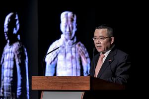 (251128) — BUDAPEST, 28 noviembre, 2025 (Xinhua) — Imagen del 27 de noviembre de 2025 del embajador chino en Hungría, Gong Tao, hablando durante la ceremonia de inauguración de la exposición «La Civilización de las Dinastías Qin y Han: Los Guerreros Terracota del Primer Emperador Chino», en Budapest, Hungría. El Museo de Bellas Artes en Budapest inauguró el jueves una de las exposiciones culturales chinas más importantes jamás celebradas en Hungría, que presenta más de 150 obras de arte antiguas de las dinastías Qin y Han (221 a. C. – 220 d. C.), incluyendo diez guerreros de terracota originales. (Xinhua/David Balogh) (rtg) (ra) (ce)