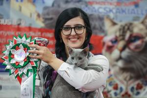 (250929) -- BUDAPEST, 29 septiembre, 2025 (Xinhua) -- Imagen del 28 de septiembre de 2025 de una propietaria mostrando su premio durante la exposición felina de la Federación Mundial Felina, en Budapest, Hungría. (Xinhua/Attila Volgyi) (oa) (ah) (ce)