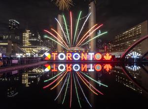 (250406) -- TORONTO, 6 abril, 2025 (Xinhua) -- Imagen del 5 de abril de 2025 de un espectáculo de fuegos artificiales presentado alrededor del Ayuntamiento de Toronto durante la celebración del Festival del 191 Aniversario de la ciudad, en Toronto, Canadá. (Xinhua/Zou Zheng) (oa) (ah)