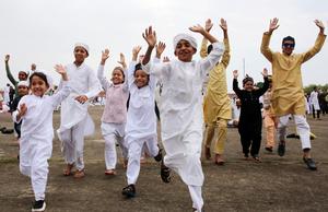(250607) -- BHOPAL, 7 junio, 2025 (Xinhua) -- Niños festejan el Eid al-Adha, en la ciudad de Bhopal, capital del estado de Madhya Pradesh, India, el 7 de junio de 2025. (Xinhua/Str) (oa) (da)