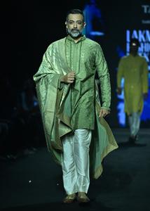 (251010) -- NUEVA DELHI, 10 octubre, 2025 (Xinhua) -- Un modelo presenta una creación de la marca india Tasva durante la Semana de la Moda Lakme x FDCI, en Nueva Delhi, India, el 10 de octubre de 2025. (Xinhua/Javed Dar) (rtg) (ra) (ce)