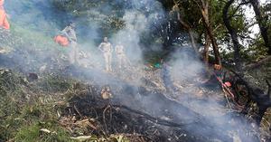 (250615) -- UTTARAKHAND, 15 junio, 2025 (Xinhua) -- Policías y rescatistas trabajan en el sitio donde se estrelló un helicóptero privado, en el montañoso estado de Uttarakhand, en el norte de la India, el 15 de junio de 2025. Siete personas, entre ellas dos niños, el piloto y cuatro pasajeros adultos varones, murieron el domingo al estrellarse un helicóptero privado sobre el montañoso estado de Uttarakhand, norte de la India, informó un alto funcionario del Gobierno local. (Xinhua/IANS) (oa) (da)
