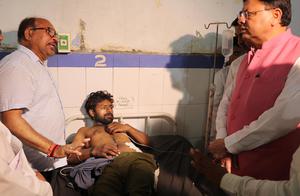 (250728) -- UTTARAKHAND, 28 julio, 2025 (Xinhua) -- Imagen del 27 de julio de 2025 del ministro en jefe de Uttarakhand, Pushkar Singh Dhami (d), visitando a una persona herida en un hospital tras una estampida en el templo de Mansa Devi, en el distrito de Haridwar, en el estado de Uttarakhand, en el norte de India. Al menos seis personas murieron y otras 29 resultaron heridas el domingo en una estampida en un templo hindú en el estado de Uttarakhand, en el norte de India, según informó la Policía. (Xinhua/UNI) (oa) (ah) (ce)