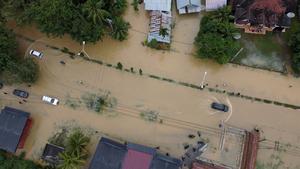 (251127) -- ACEH, 27 noviembre, 2025 (Xinhua) -- Vista aérea tomada con un dron el 27 de noviembre de 2025 de una zona residencial afectada por las inundaciones después de las fuertes lluvias, en la provincia de Aceh, Indonesia. Nueve personas murieron después de que inundaciones y deslizamientos de tierra afectaran a múltiples regencias y poblados en la provincia de Aceh, en la punta norte de la isla de Sumatra de Indonesia, dijeron funcionarios locales el jueves. (Xinhua/Yulham) (rtg) (ra) (ce)