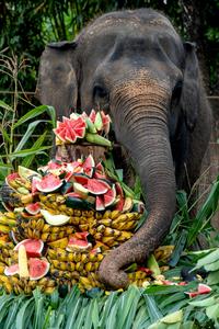 (250812) -- BALI, 12 agosto, 2025 (Xinhua) -- Un elefante de Sumatra come fruta durante la conmemoración del Día Mundial del Elefante, en el Centro de Conservación del Zoológico de Bali, en la regencia de Gianyar, en Bali, Indonesia, el 12 de agosto de 2025. El Día Mundial del Elefante se celebra cada año el 12 de agosto. (Xinhua/Dicky Bisinglasi) (oa) (ah) (ce)